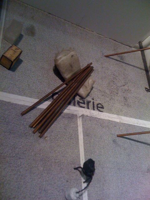diagonal. models Location : studio, year unknown Material : various detail Image 5 of 9 Description : model made for 557 in Montreal. Version including all tarps (7) all rods (14) a box of dulse , a block of wax. and propain tank with pot of food.