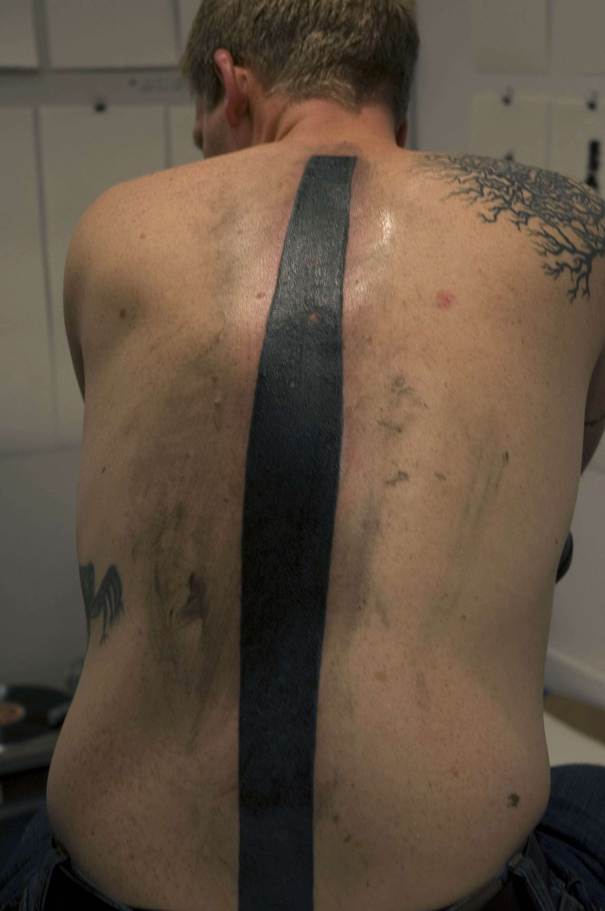 Detailed Description: The printmaker, tattooist and myself were completely enclosed in a structure with in the space of the gallery; this structure measures 12 by 8 feet (approximately) with no ceiling. The structure is fabricated using standard two by fours, pink insulation and drywall; the exterior of the structure has exposed insulation facing the viewer. The viewer was only able to experience the activity audibly and by means of a vertical window in the wall approximately two feet high by six inches wide, the window was sealed using clear safety glass. For three hours, in the enclosed structure, vinyl records were be played (chosen from my collection of vintage 1980s metal, death metal, punk and hardcore bands) for the duration of the tattooing. During that time the tattooist completed a portion of a solid black line that runs from the top of my spin to the small of my back. The printmaker  produced sequential prints (using BFK paper) from the tattoo during the three-hour period. After the three-hour session the music was shut off and the printmaker, the tattooist and myself left the structure signifying the end of the action.