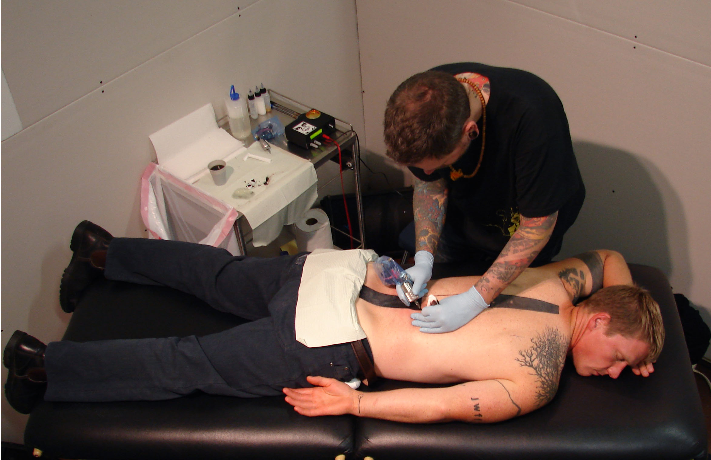 Detailed Description: The printmaker, tattooist and myself were completely enclosed in a structure with in the space of the gallery; this structure measures 12 by 8 feet (approximately) with no ceiling. The structure is fabricated using standard two by fours, pink insulation and drywall; the exterior of the structure has exposed insulation facing the viewer. The viewer was only able to experience the activity audibly and by means of a vertical window in the wall approximately two feet high by six inches wide, the window was sealed using clear safety glass. For three hours, in the enclosed structure, vinyl records were be played (chosen from my collection of vintage 1980s metal, death metal, punk and hardcore bands) for the duration of the tattooing. During that time the tattooist completed a portion of a solid black line that runs from the top of my spin to the small of my back. The printmaker  produced sequential prints (using BFK paper) from the tattoo during the three-hour period. After the three-hour session the music was shut off and the printmaker, the tattooist and myself left the structure signifying the end of the action.