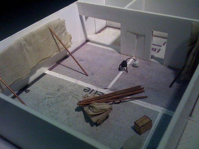 diagonal. models Location : studio, year unknown Material : various top view Image 9 of 9 Description : model made for 557 in Montreal. Version including all tarps (7) all rods (14) a box of dulse , a block of wax. and propain tank with pot of food.