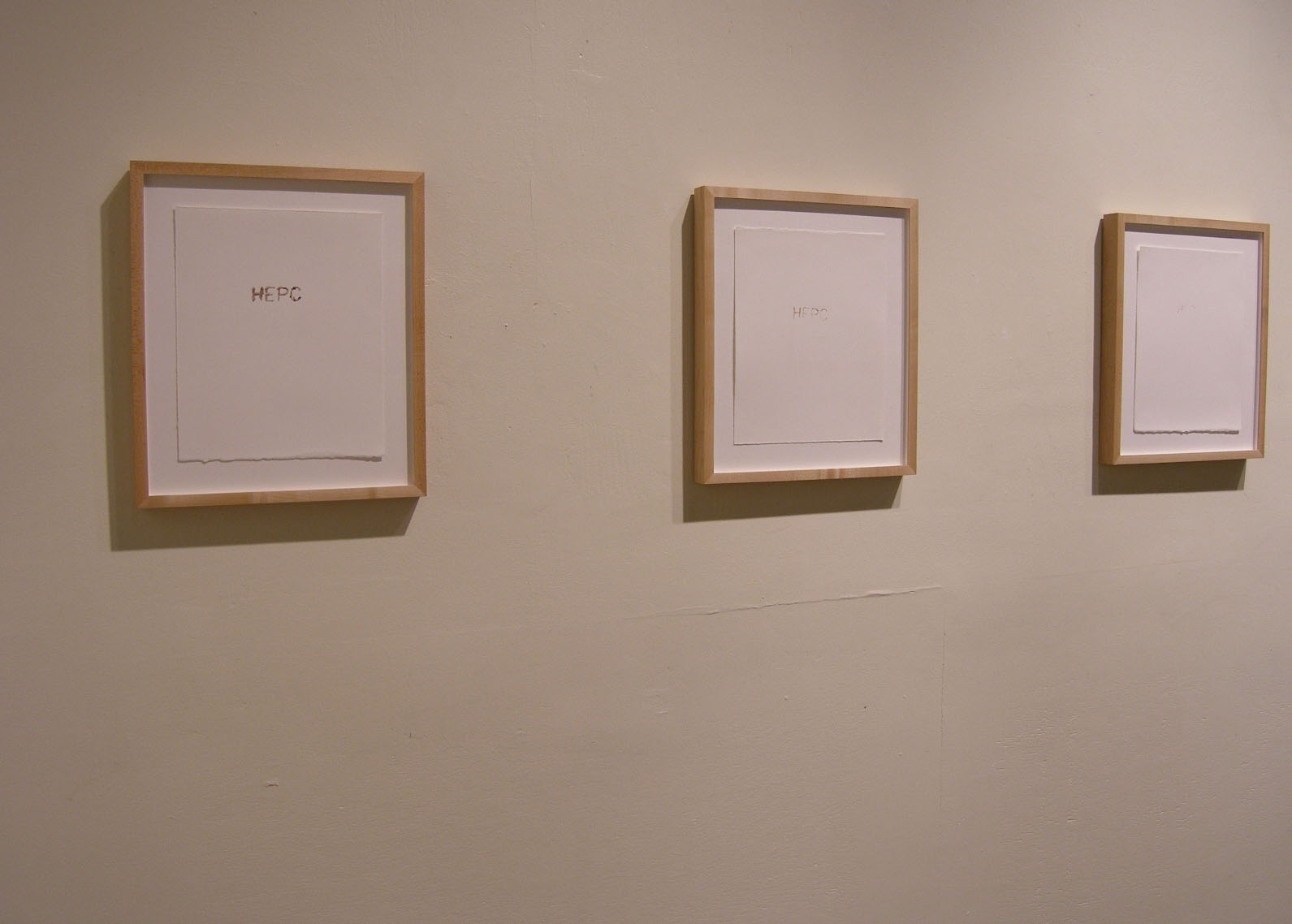 john doe. PRINTS, project Material : paper, ink, blood Location : Saint John Gallery, Saint John New Brunswick, 2006 gallery view Image 2 of 5 Description : Mirror image of letters HEPC tattooed on chest. Prints are taken by printmaker off of chest and then framed.