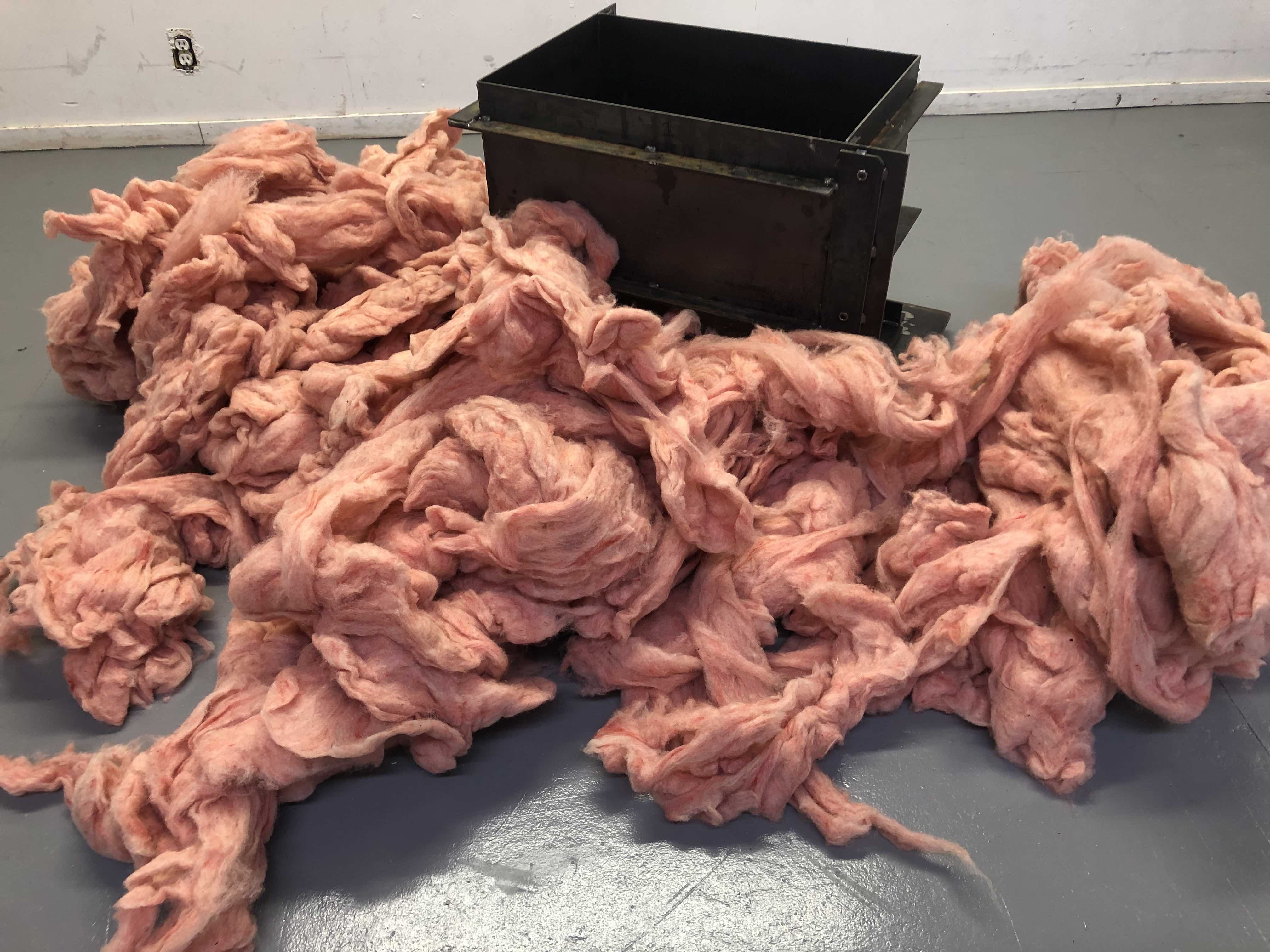Description : component of dark harbor (in progress). selenite crystal dipped repeatedly in beeswax (One foot and half in length.) Steel mold (dimensions). Wool harvested and processed Prince Edward Island.