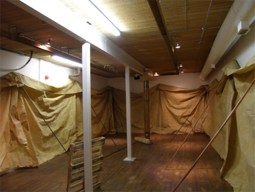 Description : The following describes events that took place each day in the gallery space from March 22nd to April 1st, 9am to 5pm 2006. Upon arrival to the Gallery I ate my bowl of granola (banana and yogurt) and then proceeded to Project: TNG 557 located in the main space. Utilizing repetition and routine as strategies I use my body to roll, fold, prop, unroll, unfold, lift, pull, shift, drag, lean, transform, manipulate etc the elements found in the gallery. The items are: seven solid copper rods, seven solid steel rods, seven beeswax tarps, pallet and a crate full of dulse (edible seaweed from New Brunswick). At noon I would take a lunch break and eat a stew I had made in the gallery the first day I arrived. After lunch I would return to Project: TNG 557 until 5 pm. I repeated this routine until I left on Saturday evening on April 1st. A video documenting the activities remained as accompaniment to the material in the gallery.