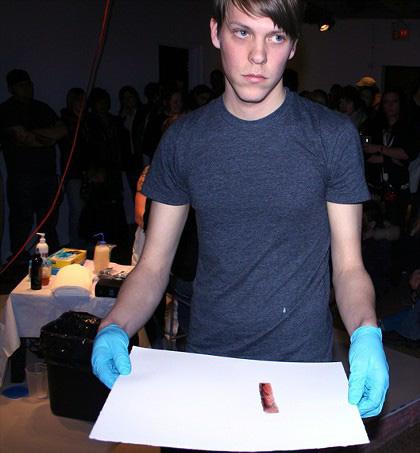 The action took place on a stage measuring eight feet by eight feet, and made of pink insulation covered by layers of drywall. Researching the archives of the NSCAD Library regarding the Lithography Workshops from the 60-80s was the inspiration for the tattoo/print edition.