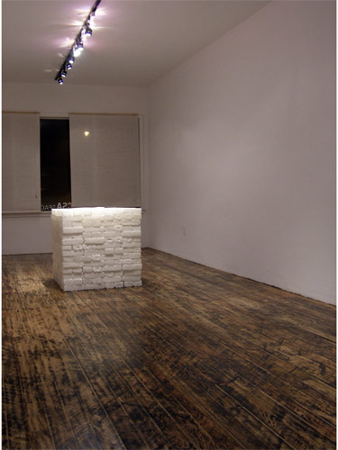 Description : Ongoing project started in 2001. Hollow paraffin wax ‘bricks’ made from rubber mold. Continuously added to pile. Bricks available for trade from artist or sale at Art Metropole. Bricks broken down and used for project 557.